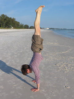 This is probably my favorite pose. There is nothing more invigorating than being up on the arms inverted to gravity and stable. To make it happen the hands must be spread wide and suctioned to the ground, arm bones flush in their joints, scapula set on the back ribs. From this base the myofascial core, deep and superficial, from the diaphragm to the pelvic floor contracts around the spinal column. The inner legs, through the heels, cut back. The knees open. Calve muscles lengthen toward the heal and the skin of the foot tightens, length and width-wise, from the heel to the toe roots. Thus, the core is effectively a continuum, from the base of the lungs to the ends of the feet. The launch position is downward dog. You can kick up with both legs to a pike before pulling upright. Or kick up one leg at a time. For example, from downward dog, bring the right foot a half a step forward. Feel the sense of spring in the joints of the toes, ankle, knee and hip. Kick up a few times just for practice. If this is new for you, kick up against a wall. In our example, the right leg is the spring leg. Being long and internally rotated within the hip joint, the left leg leads the body up into the inverted position. Blood roars to the lungs, heart and neck glands. Basil receptors kick in to regulate blood pressure. Confidence fills the body.